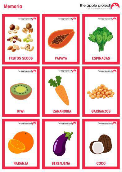 Os proponemos este mismo juego de memoria pero con alimentos. Algunas, verduras, frutos secos o incluso frutas forman parte de la dieta habitual de l@s más pequeñ@s, pero muchas veces no saben identificar a qué nombre corresponde cada alimento.